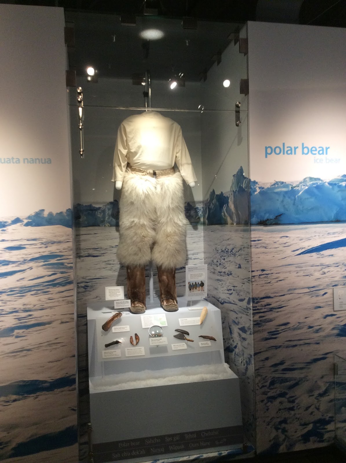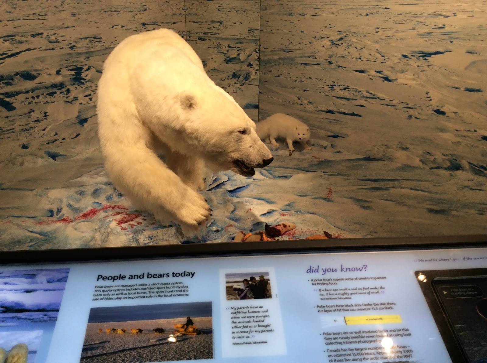 The jewel in the crown though is the museum. We spent a long time going through the building. I was very impressed with how interactive all the displays were. They have dioramas of all the various arctic animals. In front of each animal was a information stand, with statistics on the animal\’s size, habitat, etc. Many of them had pelts attached that you could touch. In a glass case beside each diorama were example of all the products that were made from that animal and tools. At the bottom of each case was the name of the animal in English, French, and several of the indigenous languages. You can also listen to audio files, some with elders talking about their experiences