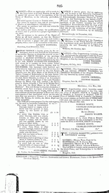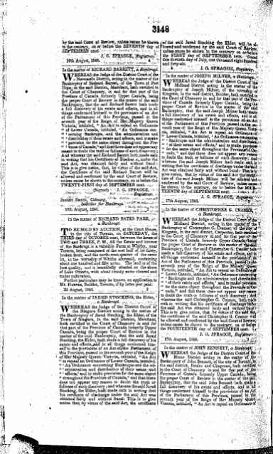 This example from 29 August 1846 shows notices on bankruptcies. Listed are Richard Barrett (Port Hope), Richard Bates Parr (Whitby), Jared Stocking (Town of Niagara), Joseph Milner (Township of Kingston), Christopher G. Cramer (City of Kingston), and John Bennett (City of Toronto):