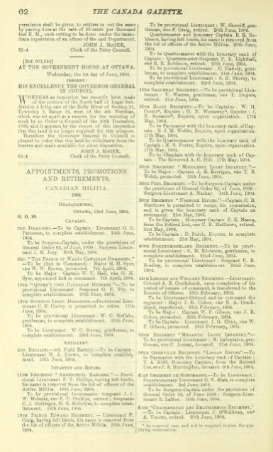 For the first years it concentrated on Government Acts and Regulations. Through subsequent years you will find notices for divorce, bankruptcy, corporate notices, Government Appointments, and so much more. Here\’s a sample page from 9 July 1904 that lists \”Appointments, Promotions and Retirements\” from the Canadian Militia:
