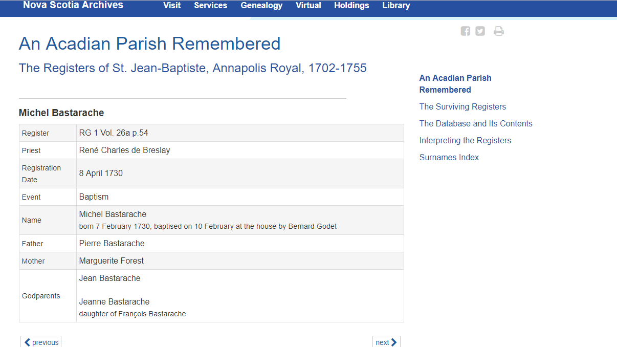 This last section is my favourite, and I\’ve used it a lot. This indexed and searchable database contains the registers of St. Jean-Baptiste in Annapolis Royal. It covers the years 1702 to 1755. You use it in the same way as you would the \” An Acadian Parish Reborn Collection\”. Unlike the collection above though, you cannot download either the image itself or the transcription. It is still a great resource though. Just look at the information I got for the baptism of Michel Bastarache, my 6x great grandfather, and one of my favourite ancestors. As an adult he caused a lot of trouble for the British military. You can read about him in the Dictionary of Canadian Biography