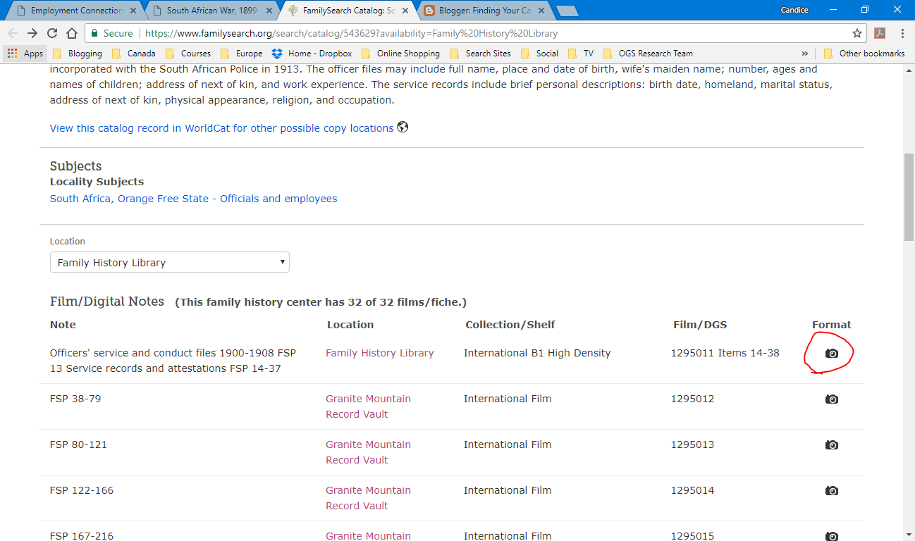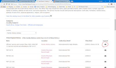 They also say that FamilySearch has microfilmed the service files. When I clicked on the link provided, it brought me to the Family History Library\’s catalog page. They have 32 rolls of microfilm pertaining to the Constabulary. Good news is that they have been digitized. Bad news is that they are not indexed.