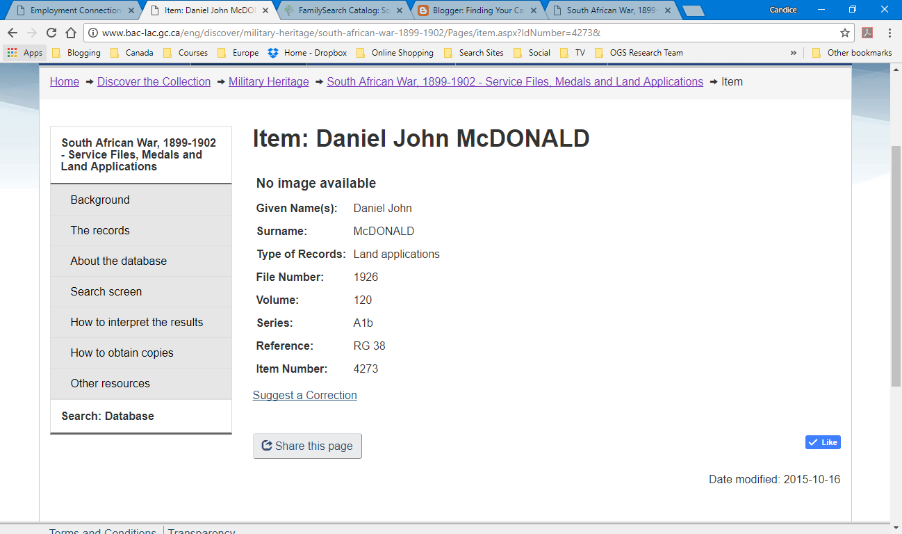 If you have an Ancestry subscription though, then you\’re in luck. They have digitized some of the records in their database Canada, South African War Land Grants, 1908-1910. By putting in Daniel John McDonald into the search, I was able to see his application. Just remember that these are 2 page applications. Don\’t forget to flip to the next page in the images, so you get a look at both pages.