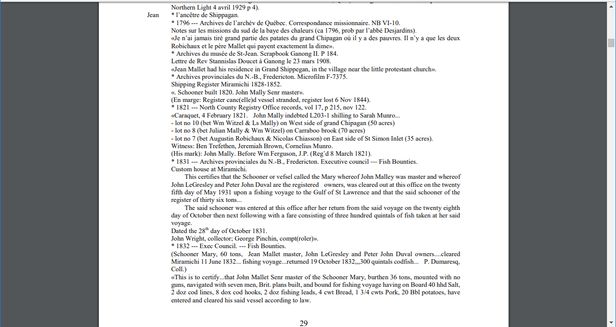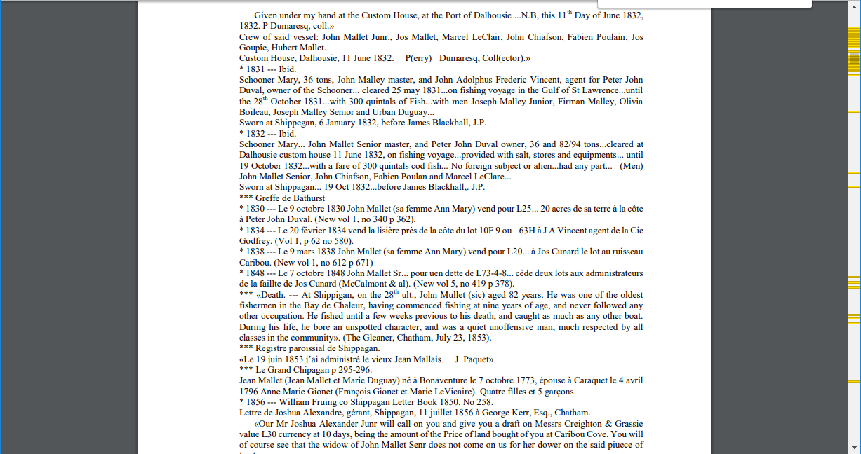 The nice thing about PDF files is that by pressing the F3 button, you should get a search box up in the top right. You can also press and hold the Ctrl button and press F. Type in your surname and it should take you to the right spot. My Grannie was Marie Anne MALLAIS. The MALLAIS, or MALLET, family were one of the founding families of the Shippegan area. I went to the PDF for the letters M to O, and searched for Mallais. Information on the Mallet/Mallais family starts on page 11 and goes to page 45! Here is what is listed for Jean MALLAIS, the \”founding father\” of the name in Shippegan: