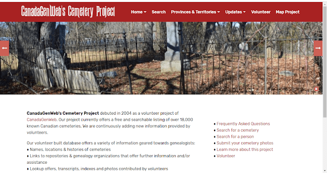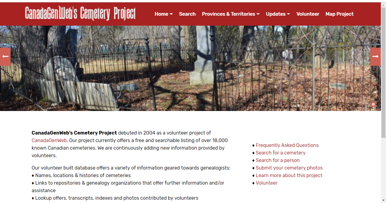 This free site is volunteer run, and has information on over 18,000 cemeteries across Canada. It has a very user friendly set up. Please keep in mind that they do not do research or take photo requests. However, volunteers have posted their willingness to help on their own, and not as part of the site.
