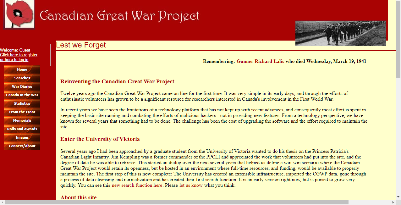 This site says that it is the largest fully searchable database of Canadian men and women that served in WWI. What I find so delightful about the Canadian Great War Project is that they are so many ways to search. It has information not only on the soldiers, but on war diaries, statistical information, and medal information. This is just a sampling of what it has to offer.