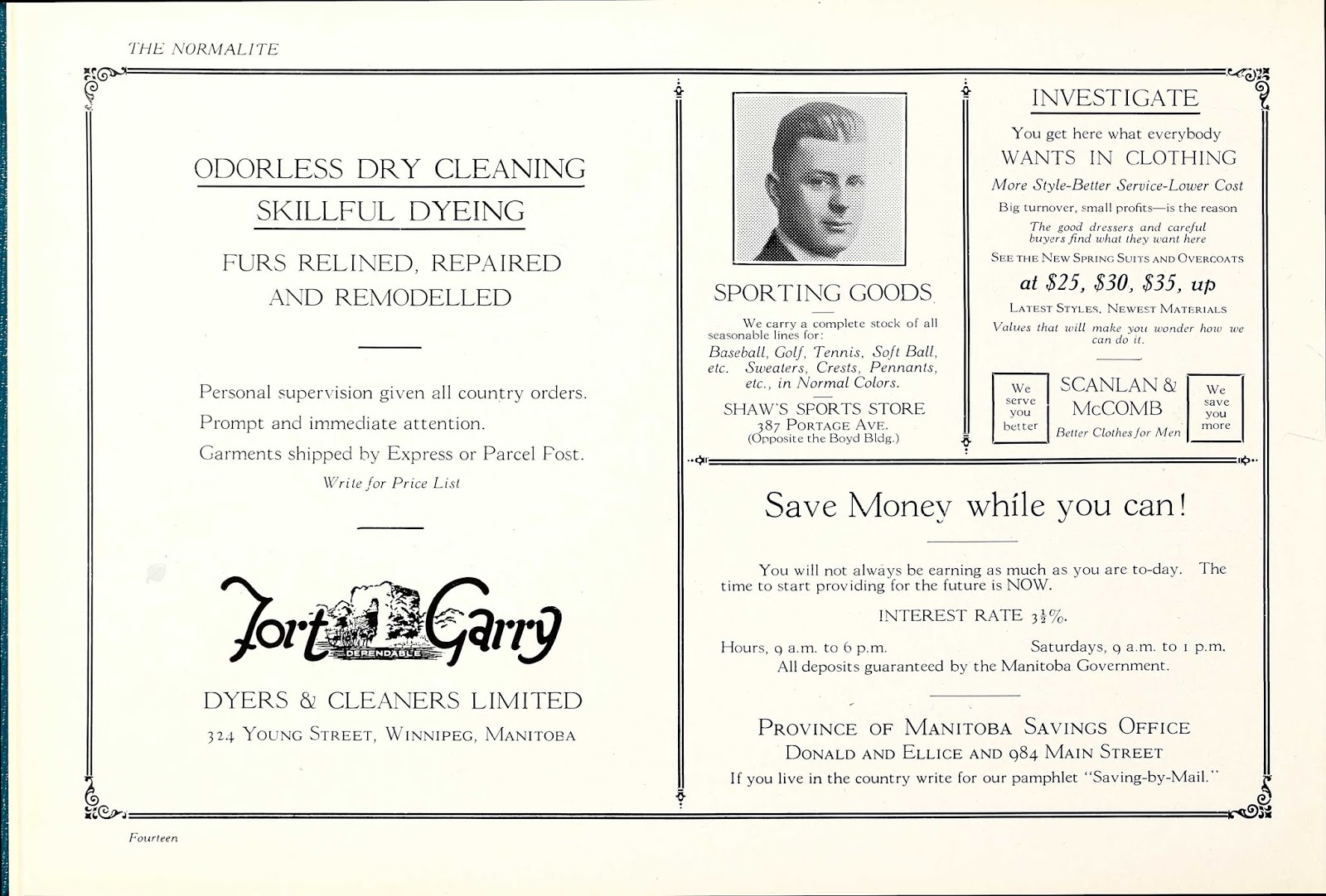 Ancestry has a collection of Canadian Yearbooks digitized in the collection Canada, Selected School Yearbooks, 1901-2010. This collection can be searched by name. or, alternatively, you can browse. The yearbooks are grouped by province, then by city, then by school. From what I could see, the vast majority of the schools only had one year digitized. And don\’t forget to look at the advertisements. As a rule, yearbooks tend to have community businesses buy ads. Here\’s an ad page from the 1928 Manitoba Provincial Normal School, in Winnipeg: