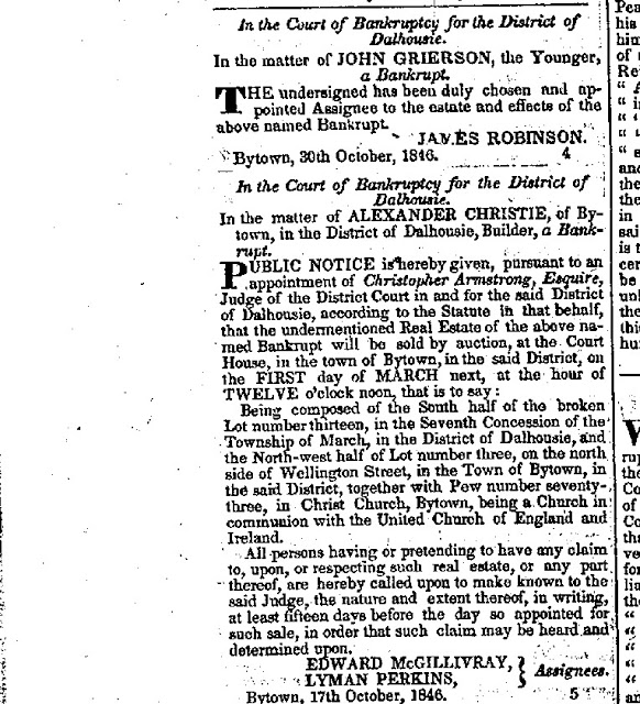 Back in 2017, I wrote a blog post about the importance of the Canada Gazette to researchers. The official newspaper of the federal government, it contains notices of all manners of petitions and bills passed. You\’ll especially want to look at this in the early years of the country. Here\’s an excerpt from November 21, 1846. It shows two notices. The first is that James Robinson is handling the bankruptcy of John Grierson. The second is a notice of an auction sale of the land of Alexander Christie.