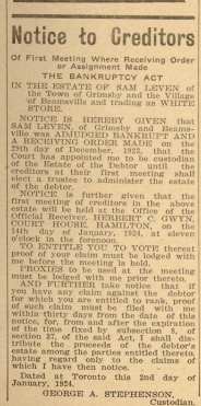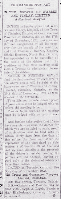 As always, newspapers are a good source to finding \”dirt\”. Check the classified ads for bankruptcy sales. If your ancestor was an upstanding member of the community, you may also find newspaper articles of their financial troubles. here\’s a couple of notices taken from Ontario newspapers. The first is from The Porcupine Advocate in Timmins, Ontario: