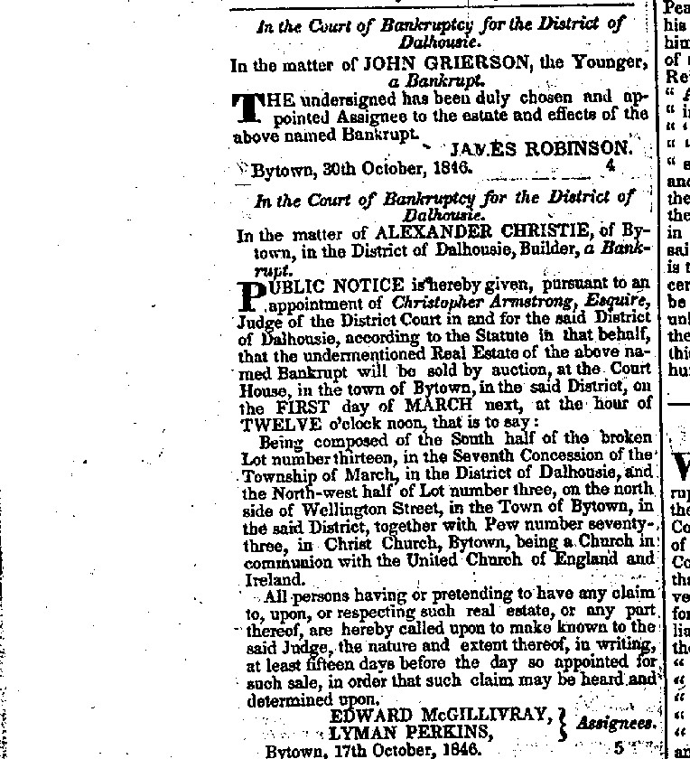 Back in 2017, I wrote a blog post about the importance of the Canada Gazette to researchers. The official newspaper of the federal government, it contains notices of all manners of petitions and bills passed. You\’ll especially want to look at this in the early years of the country. Here\’s an excerpt from November 21, 1846. It shows two notices. The first is that James Robinson is handling the bankruptcy of John Grierson. The second is a notice of an auction sale of the land of Alexander Christie.