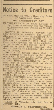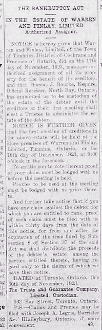 As always, newspapers are a good source to finding \”dirt\”. Check the classified ads for bankruptcy sales. If your ancestor was an upstanding member of the community, you may also find newspaper articles of their financial troubles. here\’s a couple of notices taken from Ontario newspapers. The first is from The Porcupine Advocate in Timmins, Ontario: