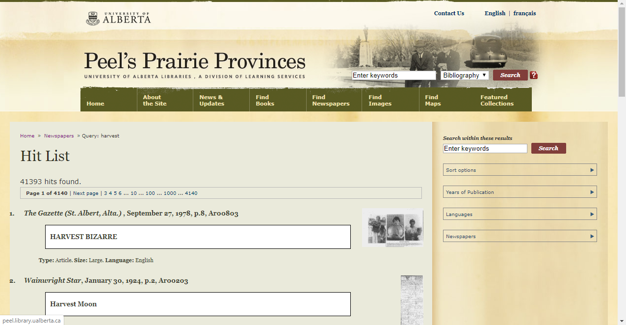 | http://peel.library.ualberta.ca/search/?search=raw&pageNumber=1&field=body&rawQuery=harvest&index=newspapers |