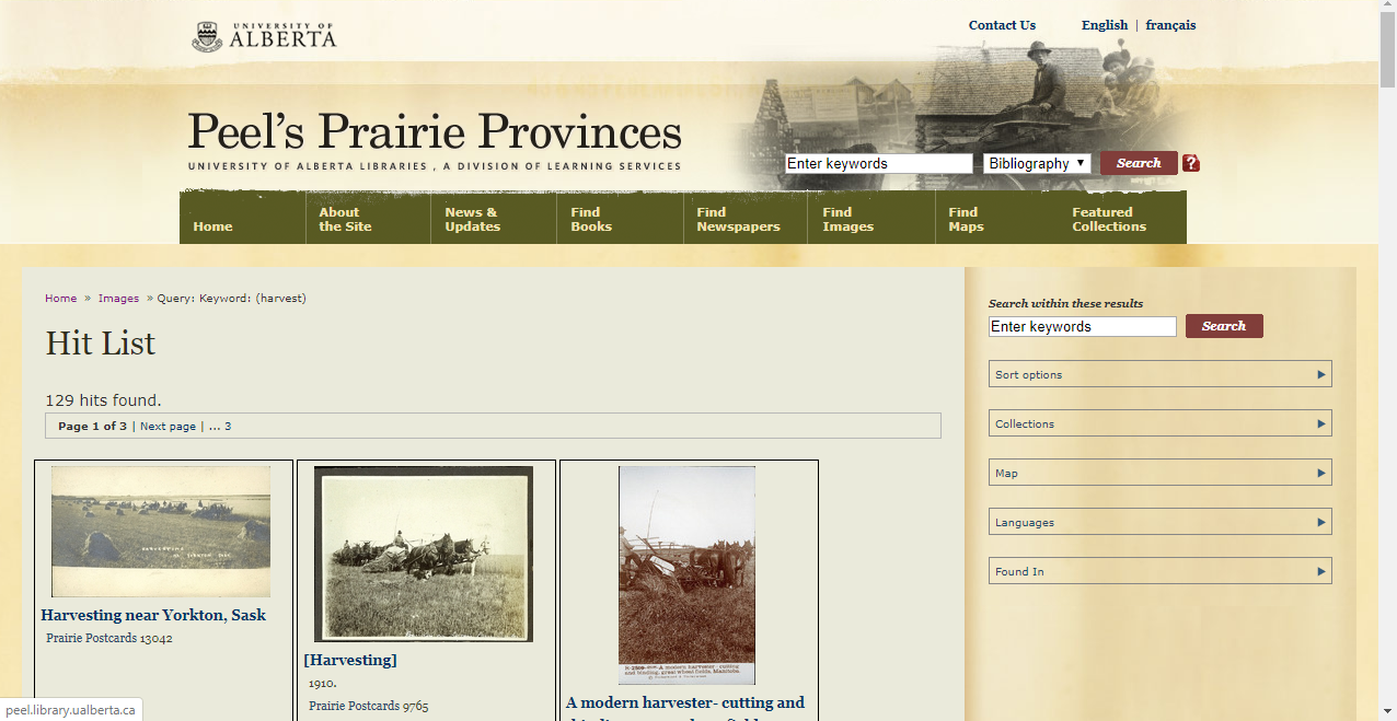 | http://peel.library.ualberta.ca/search/?search=raw&pageNumber=1&field=body&rawQuery=harvest&index=postcards |
