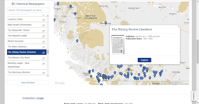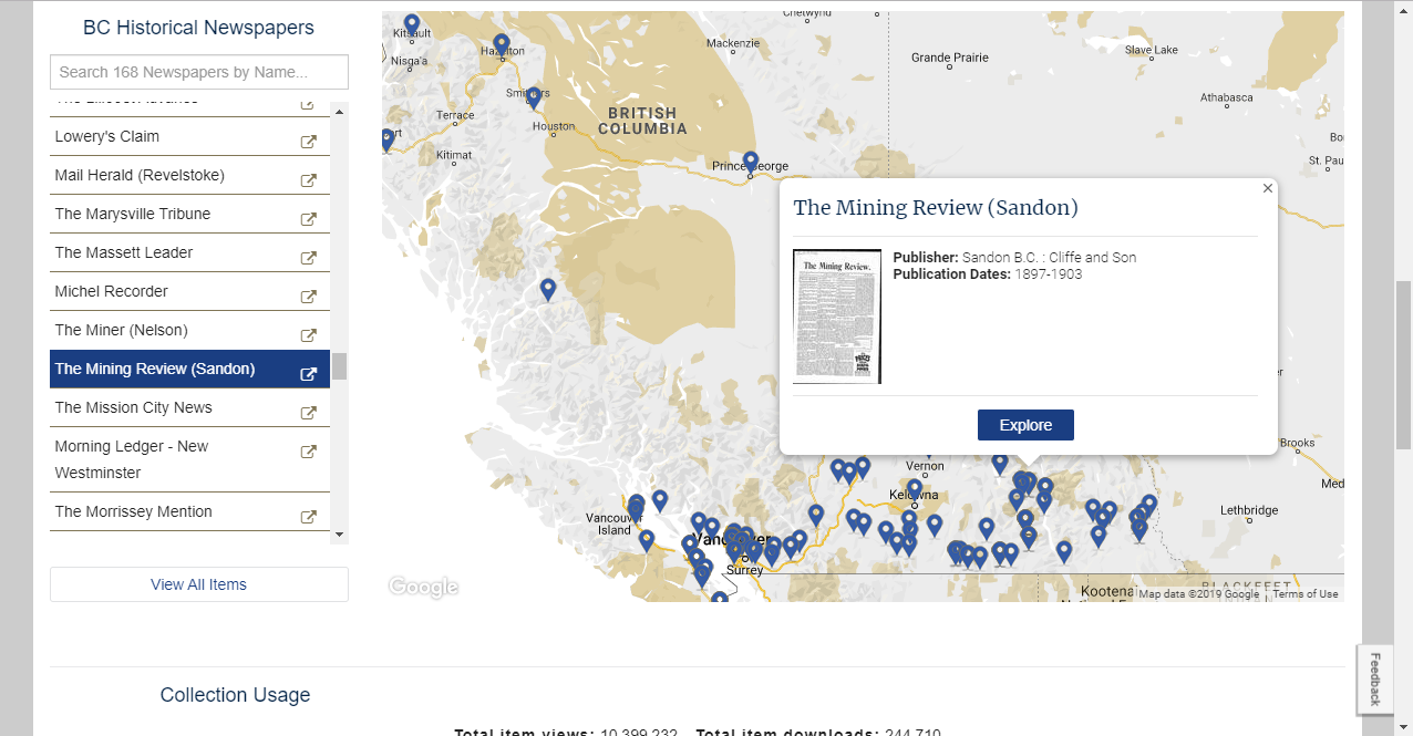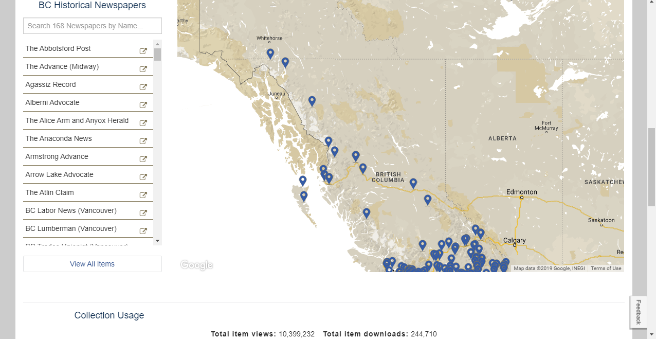 One of the UBC\’s Open Collections, the site has had over 10 million image views and over 240,000 downloads. It has 51,093 digitized copies of 168 different newspapers that cover most of the province. I was happy to see some Northern BC historical papers in the collection, as the north of the province is often ignored here. The majority of the newspapers cover the south of the province.