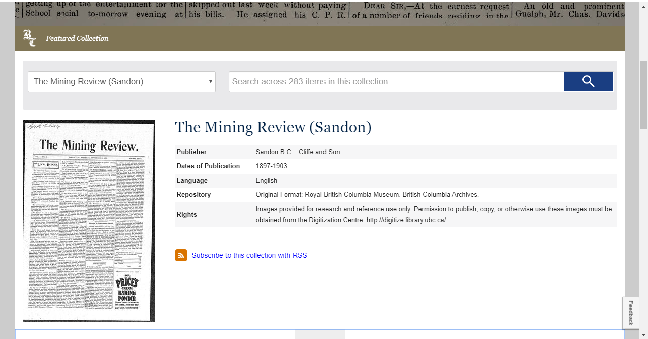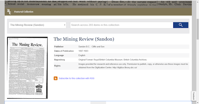 I chose The Mining Review out of Sandon BC. I did not expect to find information of my great uncle because of the publication dates. However, it might give me some insight in the history of mining in the province. Once I went to The Mining Review page, you have two options. You can use a search term in the box at the top of the page: