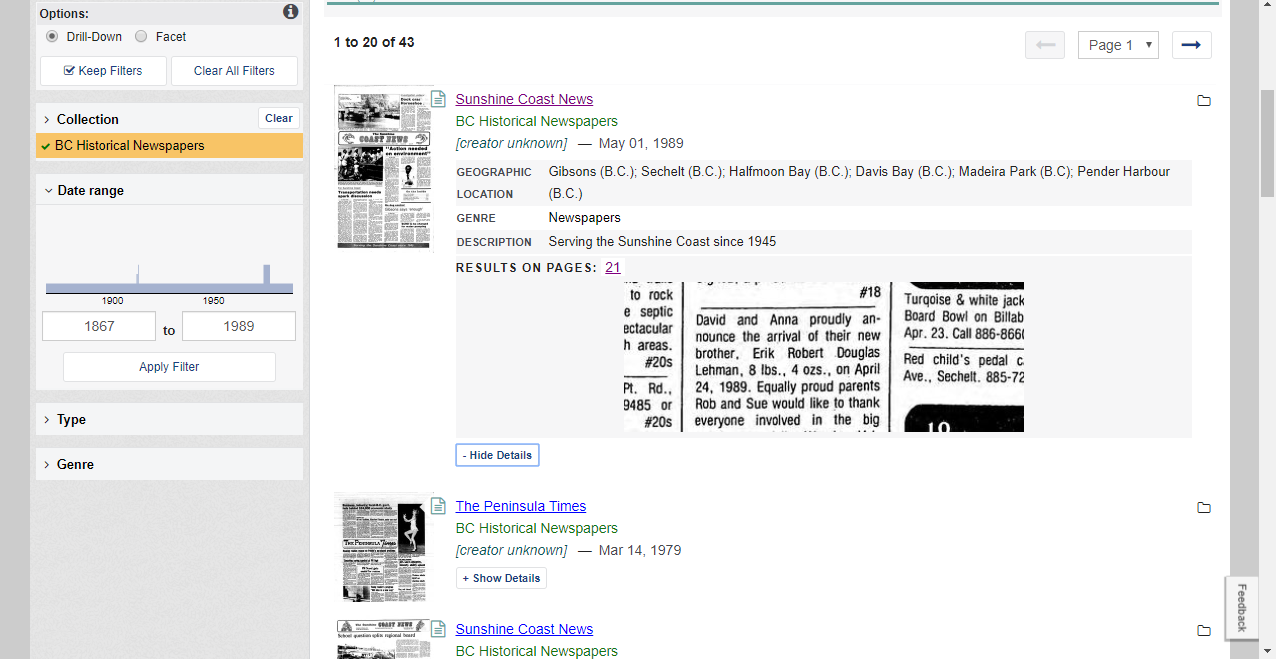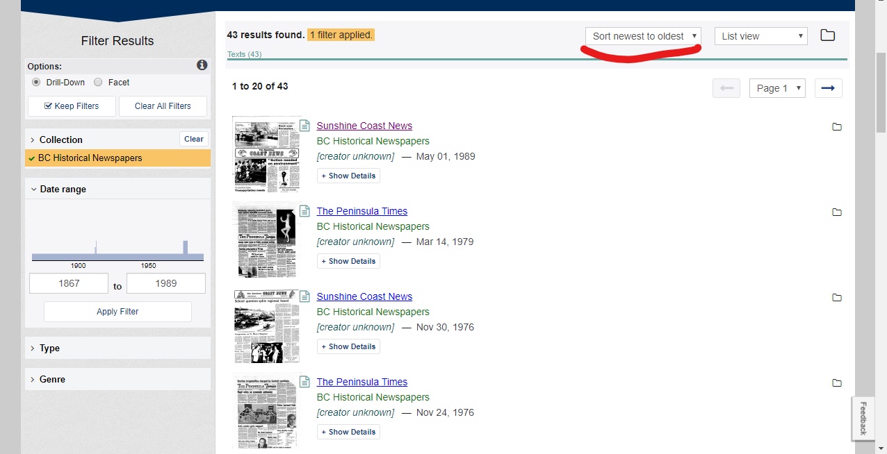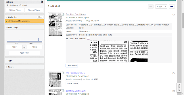 I used the general search first. The trick with the general search is to use quotations. Just typing in Robert Douglas will give me results showing all papers with both Robert and/or Douglas. By using \”Robert Douglas\” I can narrow down the results considerably. Robert moved from Ontario to BC sometime between 1937 and 1953. His son George was born in Kirkland Lake Ontario in 1937, and I first found Robert in BC Voter\’s Lists in 1953. I then filtered the results further by newest to oldest. You can do this by using the filter just to top right of the results: