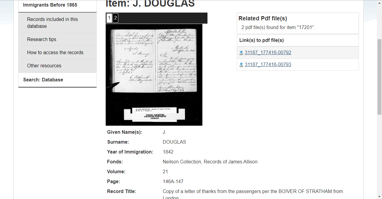 Boiver of Stratham was charging a Poll Tax to the passengers. James Allison seems to have paid the tax for them. As you can see, there are two PDF files attached. The first I could open no problem, but there\’s no J. Douglas written there. The second link, however, came up not available. So I went back to the main page and found the Neilson Collection, Records of James Allison fonds. I clicked on the microfilm number and it took me to the