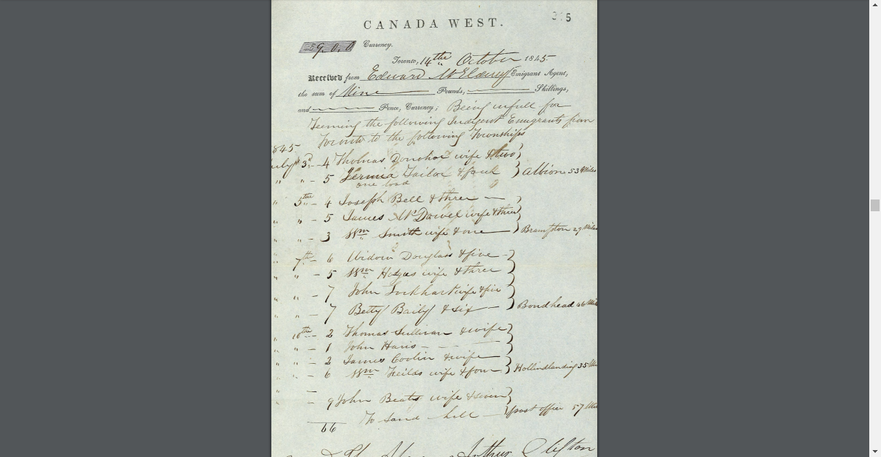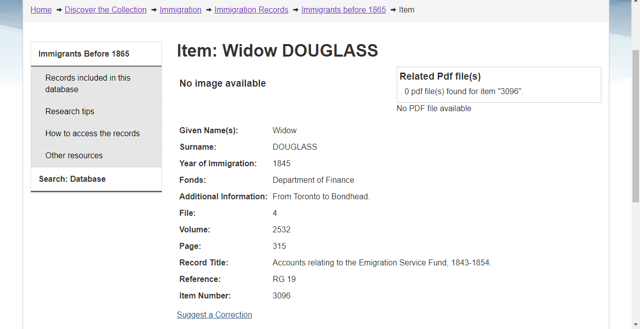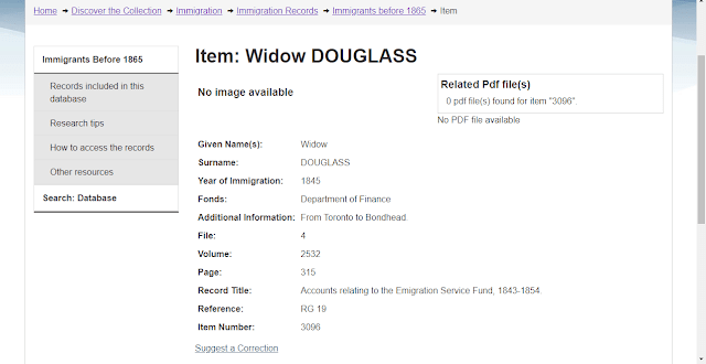 According to the information for the Widow Douglass, she went from Toronto to Bondhead. Her passage was paid by the Emigration Service Fund. Her record is on page 315. I clicked on pages 291 to 343 on the main page above. A PDF opened in a new window. Document 315 is an account of payment to teamster Arthur Clifton for delivering indigent immigrants between July 3 and 10, 1845