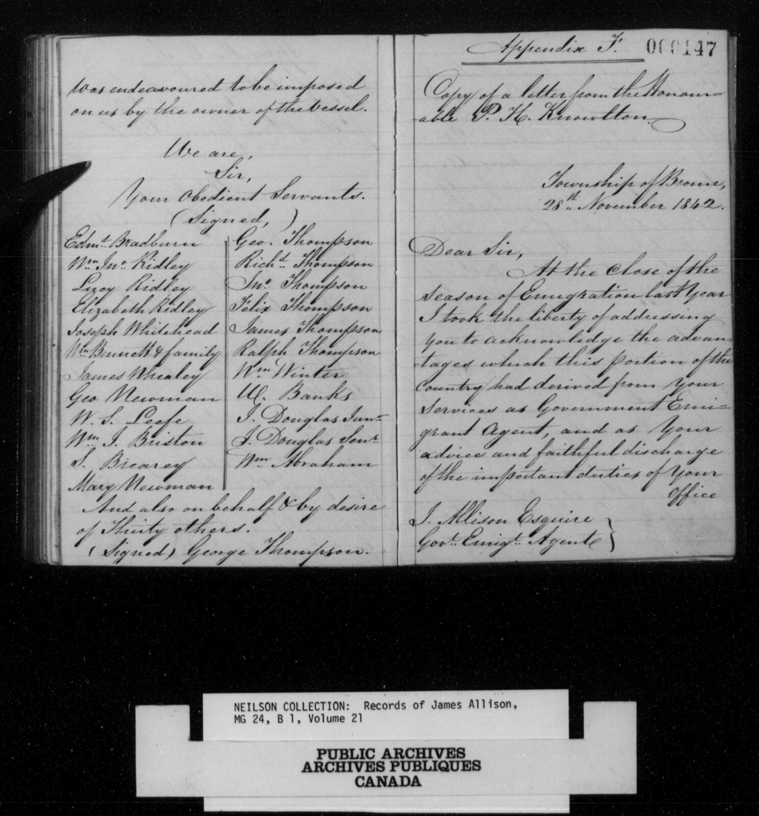 - Lists of settlers in the records of James Allison, emigrant agent at Montreal 1842, 1847