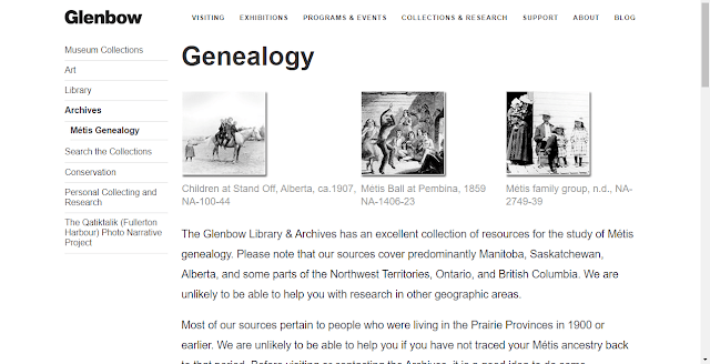 If you have Metis ancestors, then you know finding resources for them can be difficult. One of the sites you should be book marking is the online collection at the Glenbow Museum in Calgary. This online collection contains genealogies with source citations.