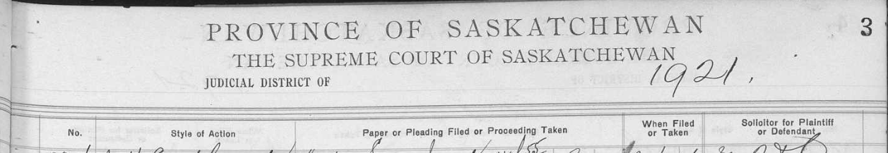 In our new \”normal\”, a lot of genealogists are celebrating more time to research. Those browse only on line collections are getting more attention, as there is now more time for genealogy. Those of you with Saskatchewan ancestors should take a look at Family Search\’s collection Saskatchewan, Judicial District Court Records, 1891-1954. This collection comprises of records for the Saskatchewan Supreme Court and the King\’s Court Bench. If you\’re unfamiliar with the Canadian Court system, you might want to brush up on what the Supreme Court covers. Family Search has a wiki that gives a nice overview. You might also want to check out a blog post I wrote just over a year ago. The post, 52 Ancestors: Week 9 – The Canadian Court System and where to find records, serves as a quick reference on where to find court records for each province and territory.