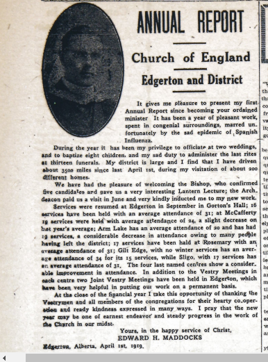 Because this is a newspaper that covers a less populated area, you\’re going to get more personal stories than you would in a large urban newspaper. For instance, in the screenshot above is the annual report of the Edgerton and District Church of England. Edward Haddocks just completed his first year as the minister, and he gave a report on how it went for him.