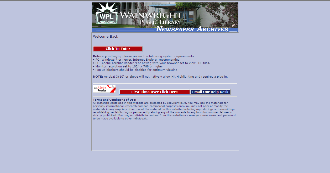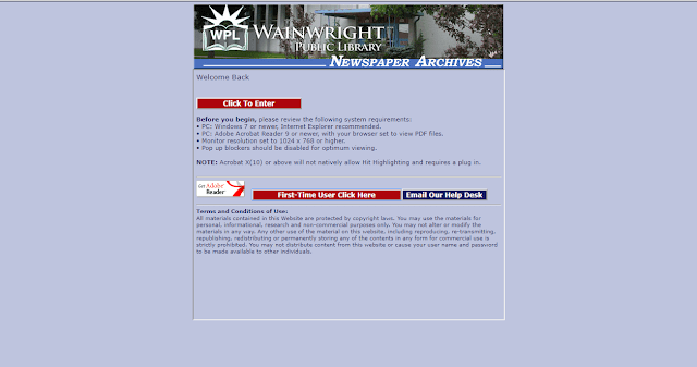 The Wainright Public Library partnered with Wainwright Main Street Project, Battle River Historical Society (Wainwright Museum) and Buffalo National Park Interpretive Centre to digitize 110 years of the Wainright Star Chronicle. It is free to use for everyone, and they have done a good job of having nice clear images. On the main portal entry page, it lets you know the system requirements to be able to use the database. If you click on First -Time User Click Here, it gives you help on making sure your computer is set up properly