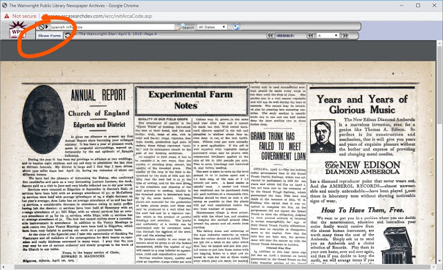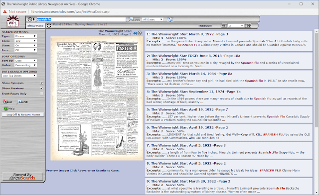 So, enter your search term in the search bar. Out of curiosity, I used \”spanish flu\”. Genealogists and Family Historians can\’t help but see the comparisons to our current circumstances 100 years later. I got 15 results. I also tried \”spanish influenza\”, and got a further 25 hits.