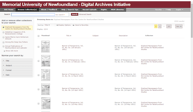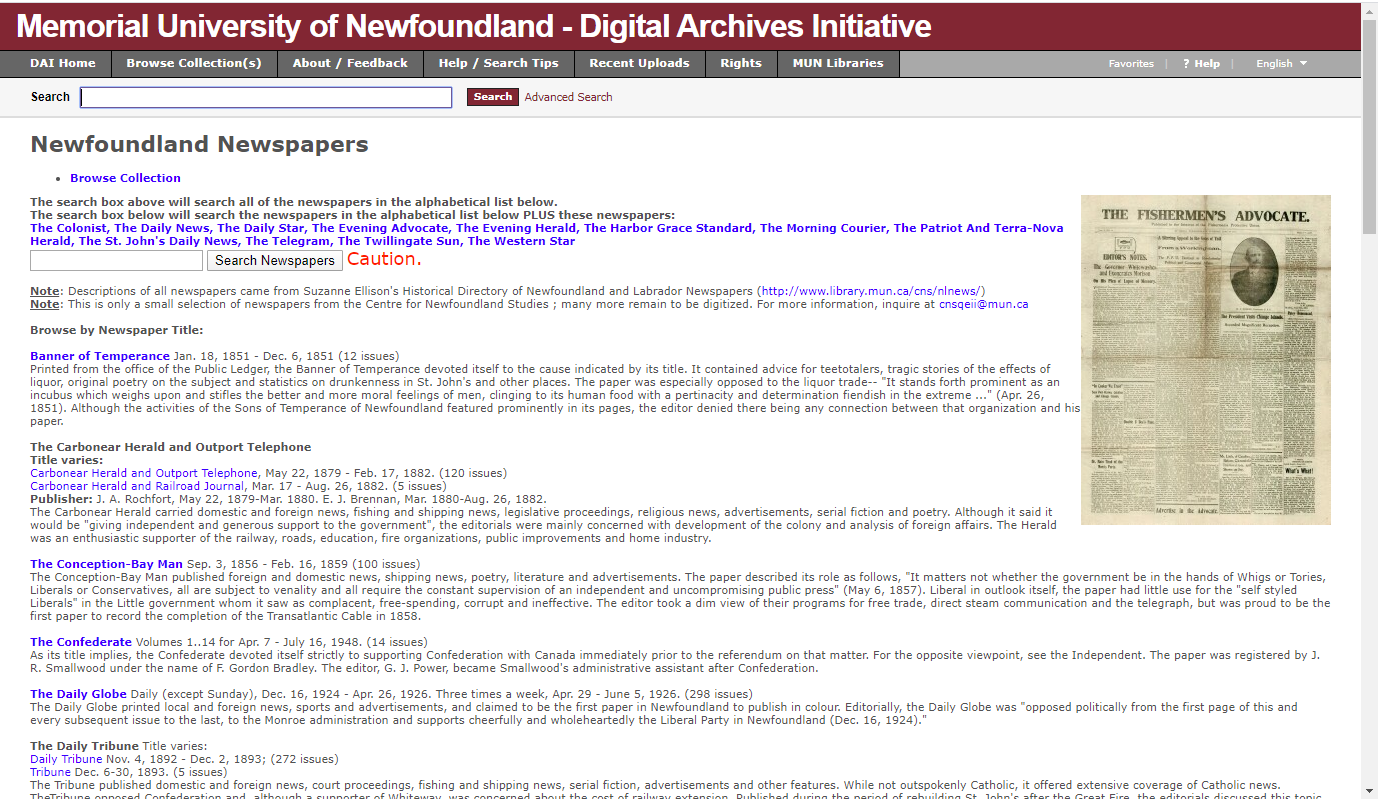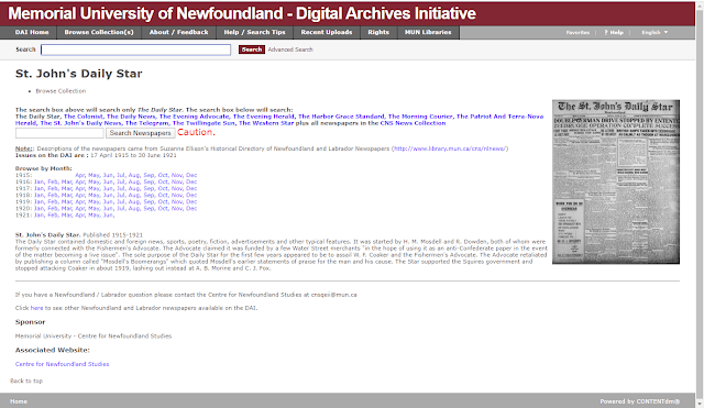 I\’m always on the lookout for online newspaper sites. Especially free ones. Recently while doing some housekeeping on my internet bookmarks, I found one from Memorial University of Newfoundland of their online collection of newspapers.