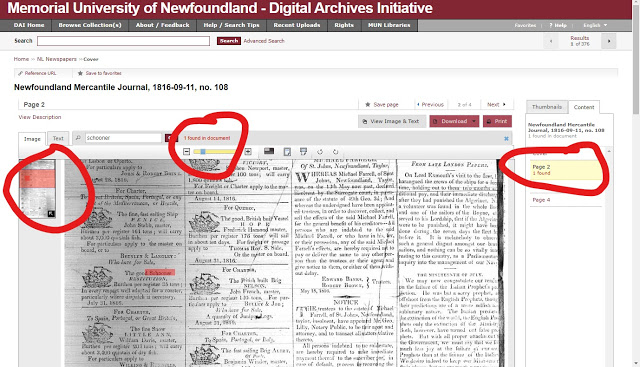 First of all, it has its own search box to search within an issue. Click on the Text Searxh tab and put your search word. Like I said, it isn\’t fool proof. It will miss mentions, mainly due to the fonts used. But it does highlight when it does find a result. It will also tell you what page and where. Here\’s an instance for searching for the word schooner in the Newfoundland Mercantile Journal, 1816-09-11, no. 108