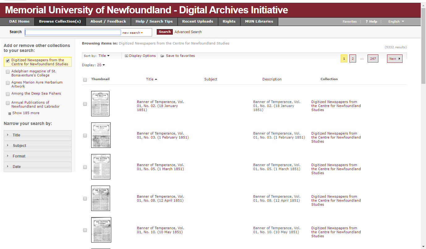 Seems like a no brainer to use the smaller search box. I typed in Greening, which is a Newfoundland surname I\’m familiar with. The search resulted in 1887 issues with that surname mentioned. On the results screen, you can filter the results by Relevance, Title, Subject, or Description. The default setting is by Title.