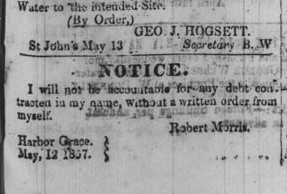 Covering from 1856-1859, this publication was the liberal leaning counterpart to The Star and Newfoundland Advocate. It\’s content was also geared towards the merchant class. Here\’s a rather interesting notice. It seems someone had been going around racking up debts in this man\’s name