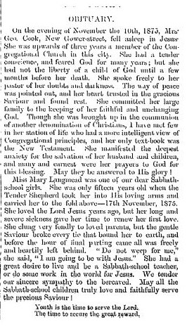 A religious newspaper, there are 12 issues each for the years 1876-1878. It consists mainly of articles of religious instruction. No publication can exist without advertisers, so of course there are advertisements as well. But here and there are news items and obituaries. Here are ones for Mrs. George Cook, and Miss. Mary Langmead from 1876.