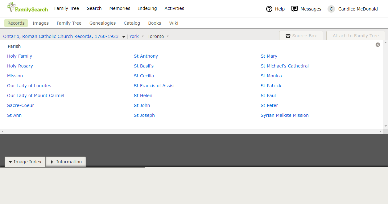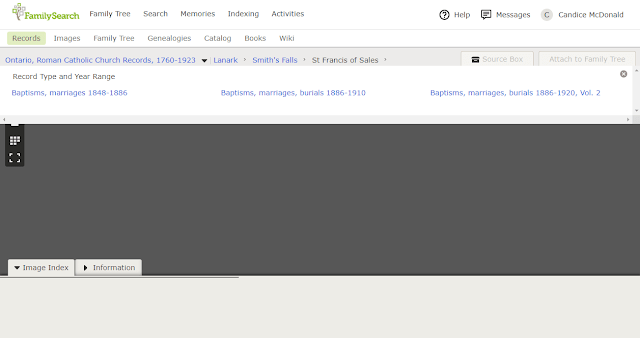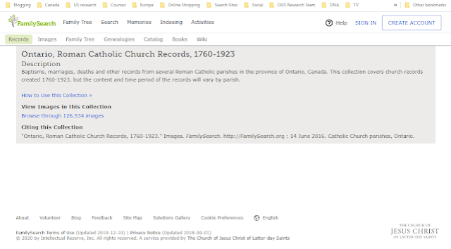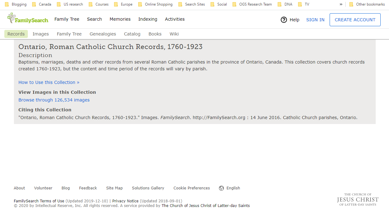 Those of us with Catholic ancestors in Canada may not always appreciate how lucky we are when it comes to online research. Compared with other religious sects, there\’s an amazing amount of church records already online. If your Catholic ancestors came from Quebec and the Maritimes, then you are no doubt very familiar with the Drouin collection. This huge collection of digitized church records are easily accessible through several different providers. However, Catholics from Ontario are somewhat left out of the party. The records for Ontario are usually scattered among Quebec records, or behind pay walls of subscription sites. But Family Search has a browse only collection on their site. Because it is a browse only collection, it does not appear in searches. As such, if you were unaware of it, you would be missing a great resource. The collection, Ontario, Roman Catholic Church Records, 1760-1923, contains over 125,000 images. Each parish has varying years within the title\’s time frame.