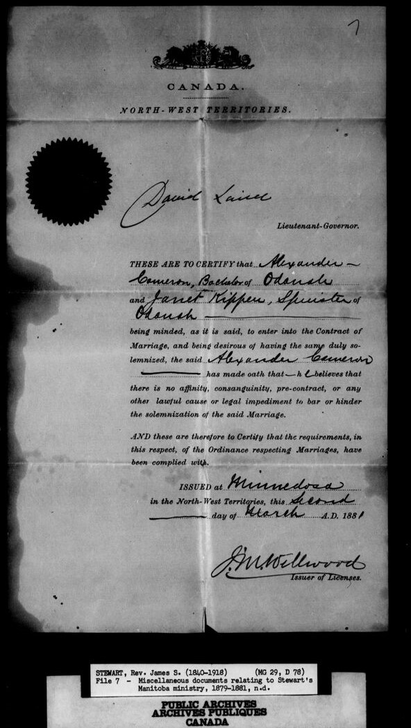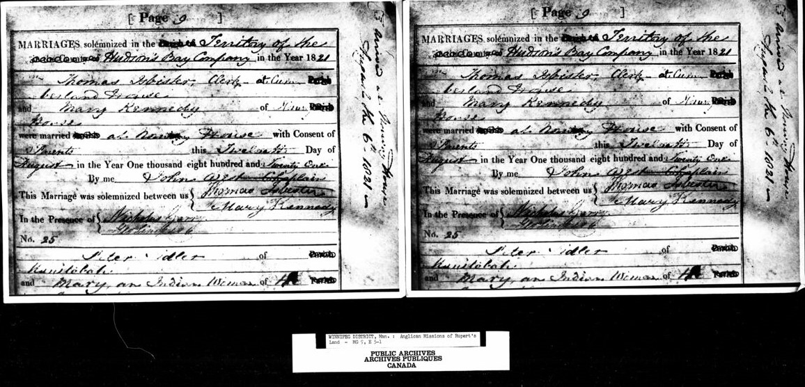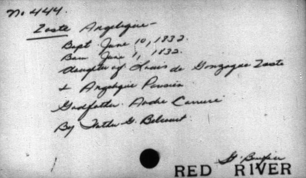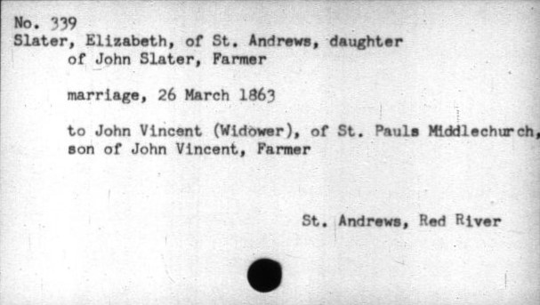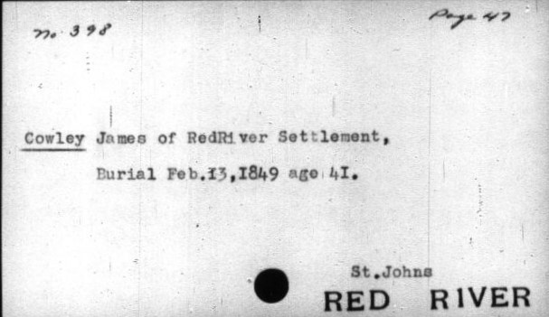 \”…The series consists of approximately 4,000 cards prepared by Clarence Kipling from the parish registers of the Red River Settlement: St. John\’s Anglican Church, 1820-1884; St. Andrew\’s Anglican Church, 1835-1884; and St. Boniface Roman Catholic Church, 1824-1834. The entries for St. John\’s Anglican Church include marriages for 1820-1878 and 1881-1882; and deaths for 1821-1823, 1825-1838, and 1841-1875. The entries for St. Andrew\’s Anglican Church include marriages for 1835-1876 and 1878-1883; and deaths for 1835-1876 and 1878-1884. The entries for St. Boniface Roman Catholic Church include baptisms for 1824-1825, 1829-1830, and 1832-1834; and marriages and deaths for 1825, 1828-1830, and 1832-1834. Library and Archives Canada does not hold the original registers to which this index relates, but the index cards contain transcripts of the information supplied by the registers. The cards originally numbered about 3,100 but additional cards were made for brides (who were not originally noticed separately from the bridegroom) and for any cards which contained multiple entries. The index cards were removed from the LAC reference room in 2009 for digitization, and vault storage in four containers: R4084, volumes 1 to 4. The cards are filed in alphabetical order: volume 1 holds surnames A to F, volume 2 holds surnames F to M, volume 3 holds surnames M to S, and volume 4 holds surnames S to Z….\” https://collectionscanada.gc.ca/pam_archives/index.php?fuseaction=genitem.displayItem&rec_nbr=115305&lang=eng&rec_nbr_list=115304,115306,115305