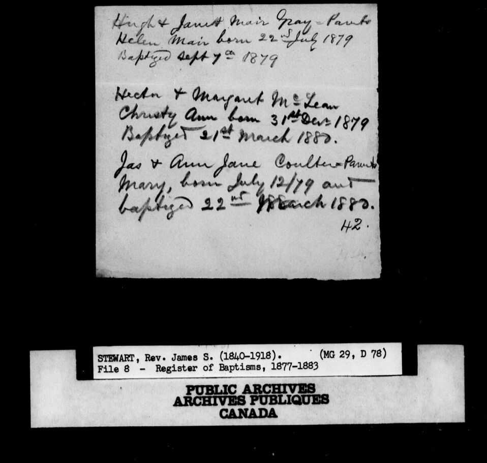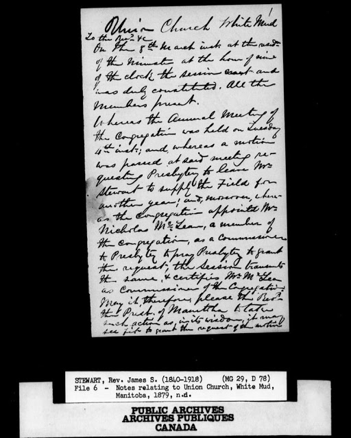 This microfilm deals with the work of the Rev. James S Stewart, a Presbyterian missionary. The microfilm contains not only BMD\’s from his Manitoba ministry. This microfilm also gives some great insight into the life of a missionary in the late 1800\’s. It contains his notes from seminary schooling, and other little bits of the mundane in his professional work. If you wanted an insight in what a missionary\’s life was like, then it is quite informative. If you looking only for BMD information, then you\’ll want to concentrate on images in the last half of the roll. There are financial sheets as well, naming individual parishioners.