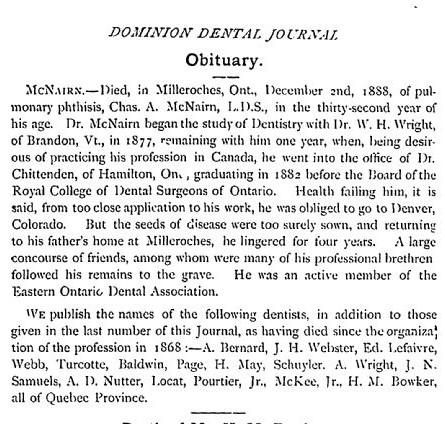 - Dominion Dental Journal – a periodical published by the Ontario Dental Association. There are 116 issues available, covering the years 1889 to 1900. It is filled mainly with \”shop talk\”. If your ancestor was an author or contributor, then you\’ll have a nice addition to your collection. But it also has information on individual members. Here\’s an obituary for Dr. Chas A McNairn. At the bottom are deaths of other dentists belonging to the Association