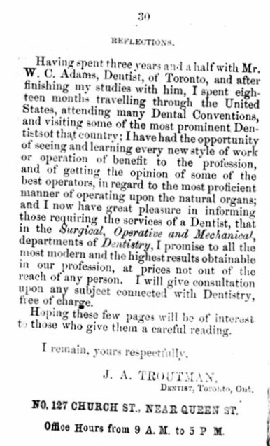- The family dentist : a treatise on the importance of the teeth, on their structure, disease and mode of cure, also managing and regulating of children\’s teeth, &c by J.A. Troutman, Dentist – an overview of dentistry from 1872. If Dr. Troutman was part of your family tree, the last page gives an account of his movements while researching the treatise