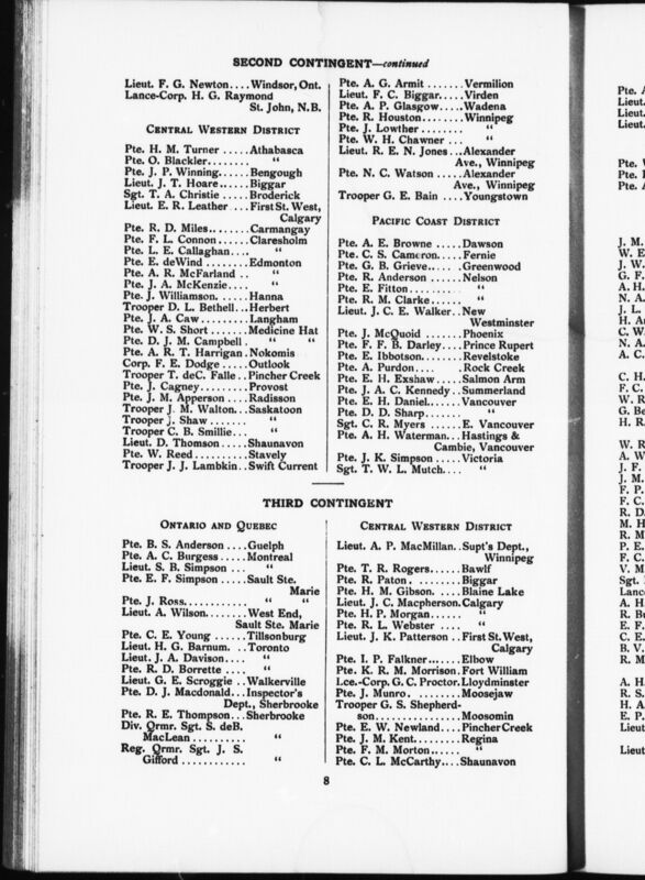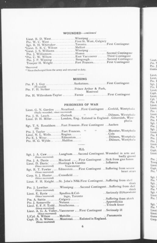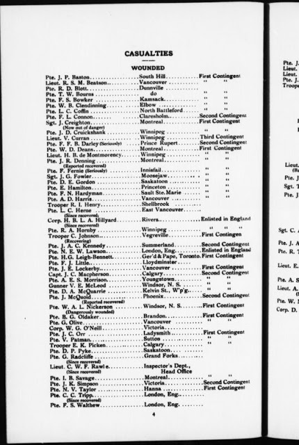 What I find are interesting is the extra information you can find here. In the Prisoners section, it tells you were they are being kept as a P.O.W. In the Ill section, you can in some cases see the cause of illness. As with other sections, you get name, rank, contingent/enlistment information, and the CIBC branch they belong to. Those researching Corp DA Wilson would find the fact that he enlisted in England a handy bit of information.