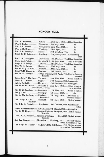 After the preface, the first section of each issue is the Honour Roll section, showing those who had died in the War up to that issue. By Volume 3 in late 1915, the Honour Roll was already growing. It lists name, rank, CIBC branch, date of death and cause of death.