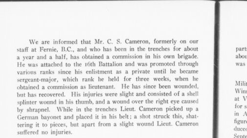 Look at what was written about Mr. C S Cameron, who worked at the Fernie, British Columbia branch. This was from Volume 7 in July 1916