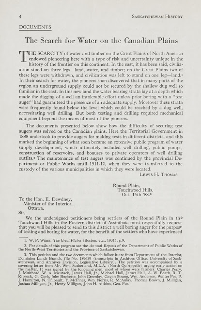 Each issue has articles on different aspects of early pioneer life. The articles are well sourced, complete with citations.In the very first issue (Winter 1948) there is a small article highlighting a problem early settlers had that was unique to the Prairies: readily available water.