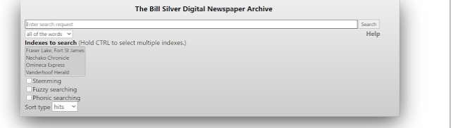 After his death, his wife Edith continued the collection until her death in 2003. The collection of weekly newspapers runs from 1917 to 2007. It is the result of a collaboration between the Vanderhoof Public Library and the Vanderhoof Heritage Museum. Simply enter in a search term and you get digital images of the newspaper pages. Just click on the link on the top of the page to get to the search screen.