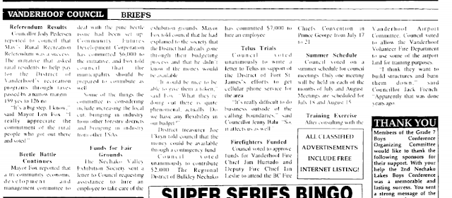 Here\’s some items covered during recent Vanderhoof Council meetings in June 2001
