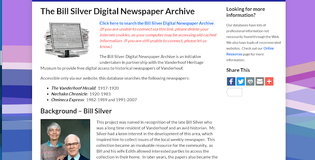 Free online newspaper sites are always a good thing. If your ancestors lived in and around Vanderhoof, British Columbia, you\’ll want to explore The Bill Silver Digital Archive. Provided free of charge, it is hosted on the Vanderhoof Public Library website.