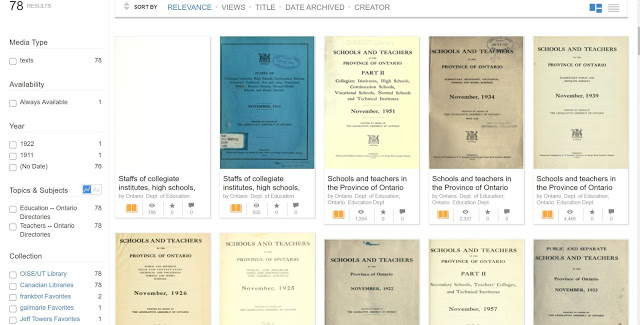 The recent reopening of schools in Canada are in news headlines. I consider myself thankful that I don\’t have to make the hard decision on whether or not to send a child to school. So I decided this week to see what I could find on Internet Archive relating to schools. As always, I was able to find an interesting resource. If your Ontario ancestor was involved in education, then you\’ll want to look at Internet Archive\’s selection of School and Teacher Directories.
