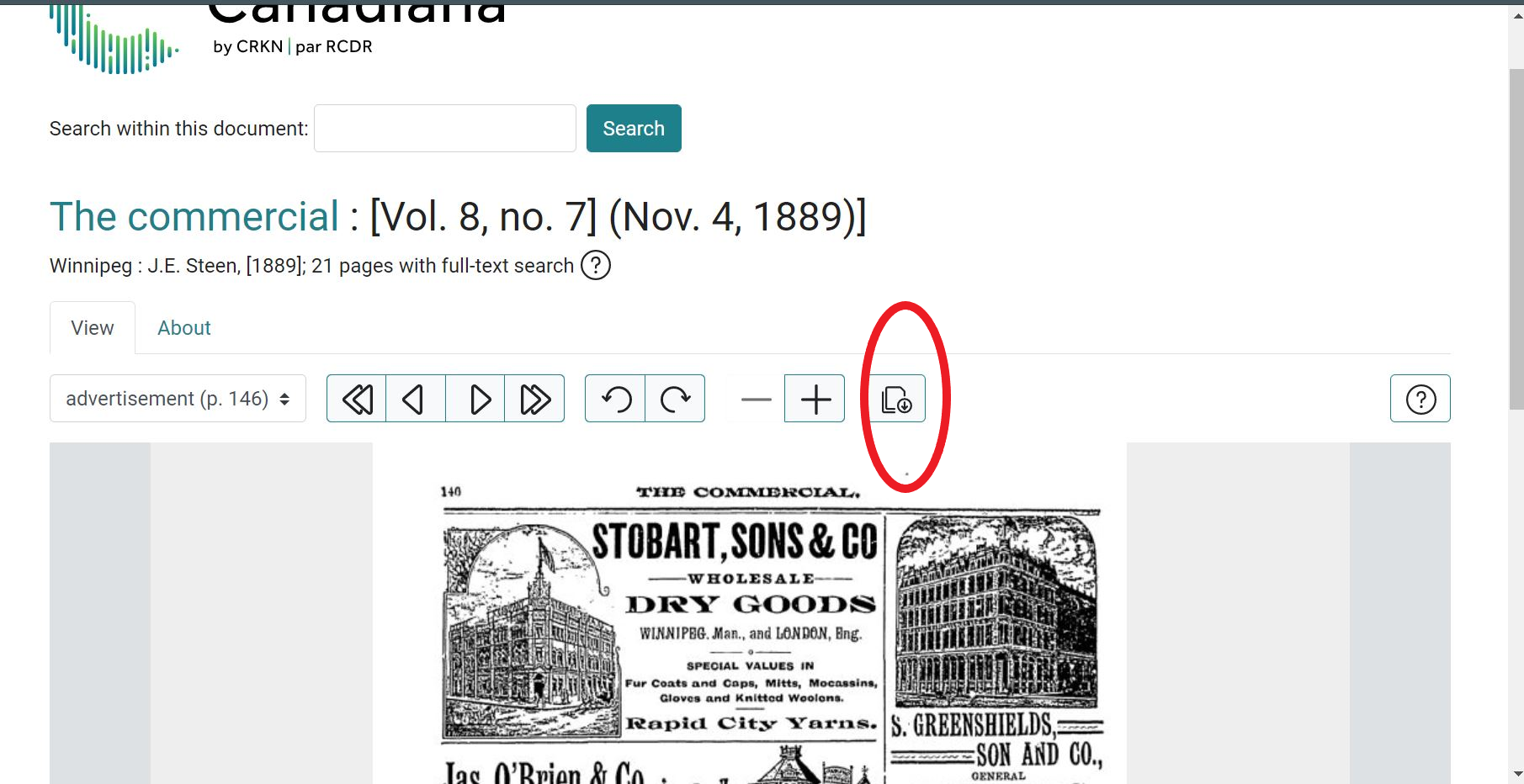 Canadiana lets you download whole issues by clicking on the PDF icon next to the \”+\” sign.
