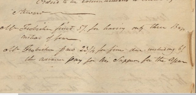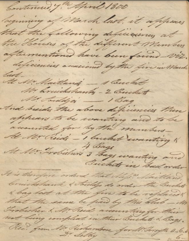 Fines were also given for not having the required items. In 1799, each member was required to provide a book, six buckets and four bags. Mr. Frobisher was fined because he only had 3 bags.
