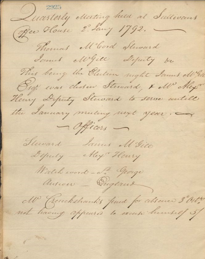 There are names interspersed throughout the minutes. Coffee Houses appear to be their regular meeting place for quarterly meetings. Attending the meetings was important. A member by the name of Cruickshanks was fined for non attendance in 1792. Further reading of the minutes showed that he was fined for absence on a regular basis.