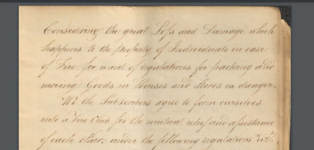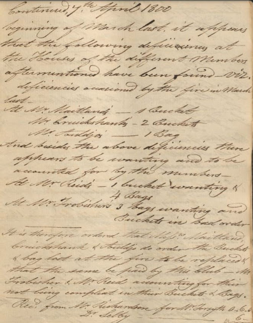 In March of 1800 there was fire and it came to light that many of the members did not have the required equipment. There was a discussion about it at the following April meeting at Teasdales\’ Coffee House