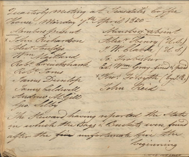 One such find is online at the McGill University Archives Collection website. If your ancestor was a business owner in Montreal from in late 1700s/early 1800s, they might have been a member of the Montreal Fire Club. Founded by prominent businessmen and merchants of the era, the club was founded to help protect assist its members from fire. They had their own firefighting equipment and would come to the assistance of any member if their homes or warehouses caught fire. McGill University has digitized one their minutes books and it is available free to view as a PDF.